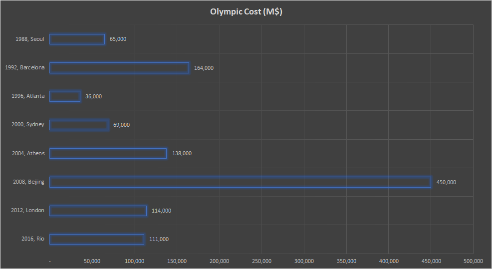 이를 통틀어 봤을 때, 올림픽을 유치하는 것을 통해 수입은 평균 약 35억~45억 달러라고 추정되고 있습니다. 그런데 1988년~2016년까지의 평균 개최비용인 143억 달러를 고려해보면, 올림픽 개최=적자입니다.