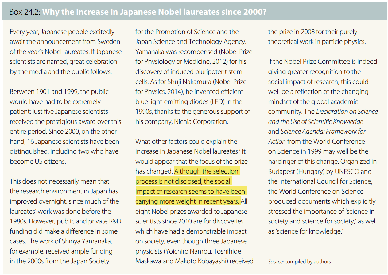 또 하나의 이유로는, 노벨상 수상자들을 선정하는 기준 자체가, 2000년을 기점으로 바뀌었을 가능성이 있습니다. 2015년에 발표된 유네스코 과학보고서에 따르면, "수상자를 선정하는 과정은 공개되지 않았으나, 최근 몇 년간, 연구의 사회적인 영향력에 대해 좀 더 비중을 두는 것처럼 보인다." 라고 평가하며, 수상자 선정 기준이 바뀐 것이 아니냐는 가능성도 지적하고 있습니다.