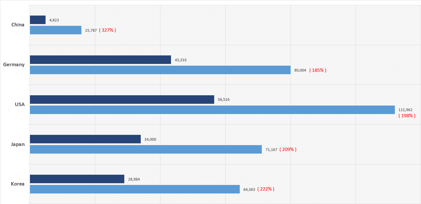 위 그래프는 각국의 시간당 노동생산성에 평균 연간 근로시간을 곱한, 각국 노동자 1인당 연간 생산수준과, 실제로 받고 있는 평균 연봉을 달러화로 비교하여 나타낸 그래프입니다. 간단히 말하면, 진한 파랑이 실제 연봉이고, 하늘색이 샐러리맨이 벌어다주는 수익이죠. 붉은 색은 실제 연봉대비 수익의 비율을 뜻합니다. 참고로 2015년 기준입니다.