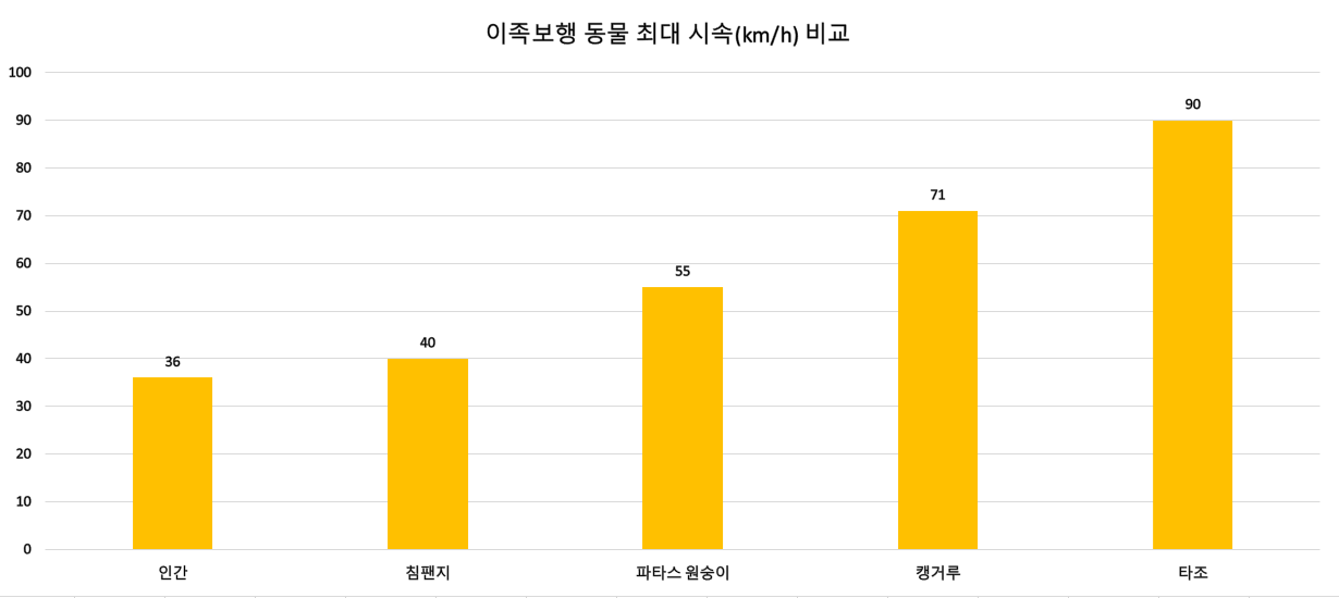 침팬지는 엄밀히 말해 완전히 자유롭게 직립보행을 하지는 못하며, 지상에서 걸을때는 주로 손등을 땅에 대고 걷는 너클 보행을 주로 합니다. 그럼에도 불구하고 작정하고 달릴경우 40km의 속도까지는 낼 수 있다고 합니다. 다만, 침팬지와 같은 유인원들은 숲에서 나무를 타며 사는 것에 특화되었기 때문에, 근지구력은 인간에 비해 뒤떨어지는 편입니다.