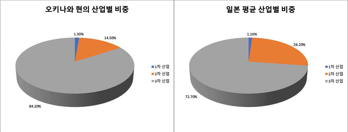 오키나와의 경제는 지역 특성상, 관광과 서비스업이 유독 발달한 형태로, 상대적으로 1차산업과 2차 산업의 비중은 적은 편입니다. 하와이와 비슷하게 관광 이외에는 이렇다할 사업은 없는 편이며, 그 대신 주일 미군 기지에 의한 경제 효과가 있는 편입니다.