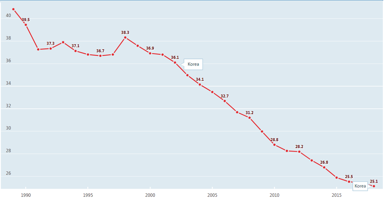 사실 한국의 자영업자 수는 많이 줄어든 편입니다. 1991년까지만해도 자영업자 비율은 점점 줄어들어왔고, 그 이후 90년대 초중반까지는 되려 상승하기 시작합니다. 그러다가 이 상승 추세를 반전시킨 것이, 1997년 외환위기였죠. 외환 위기는 많은 대기업들이 파산할 만큼 큰 위기였고, 많은 자영업자들도 덩달아 도산했습니다.