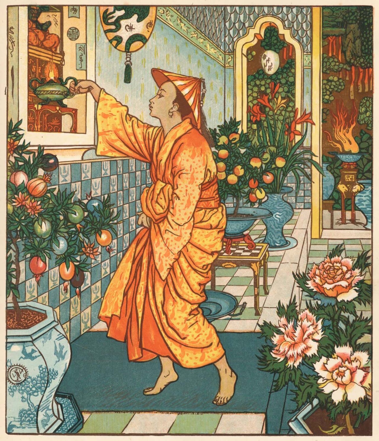 디즈니 애니메이션에서는 "흰 터번을 쓴 까무잡잡한 피부의 소년" 같은 식으로 알라딘이 묘사되다보니, 알라딘은 아랍인이라는 이미지가 있는데, 사실 이는 원전에 나오는 알라딘과는 거리가 멉니다. 19세기의 화가인 월터 크레인이 그린 알라딘의 삽화를 보면, 이 그림 속에 등장하는 알라딘은 동남아식 갓을 쓰고 있으며, 일본 기모노 같은 걸 입고 있습니다. 당연히 대단히 편향된 시각으로 묘사된 알라딘이지만, 이것이 당시 사람들이 알라딘에 가지고 있던 이미지에 보다 가깝죠.