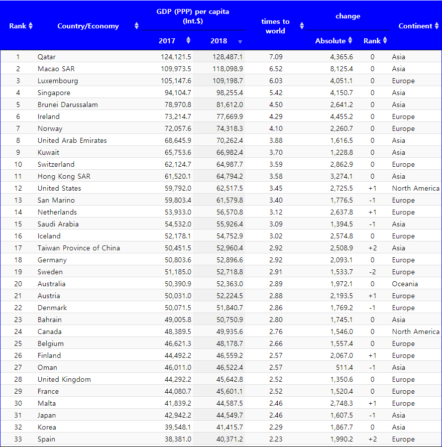 구매력평가(Purchasing Power Parity) 기준 GDP란, 한 국가 내의 국내 총생산(Gross Domestic Product)에 구매력평가를 적용하여, 해당 국가의 물가수준을 감안한 소득 수준을 나타내는 수치입니다. 이를 전체 인구로 나눈 것이 1인당 PPP로, 일반적으로 생활 물가가 상대적으로 싼 개발 도상국들의 수치가 높게 나오고, 물가가 비싼 선진국들의 수치가 낮게 나오는 경향이 있습니다. 그럼에도 불구하고, 선진국들이 압도적으로 높지만요.