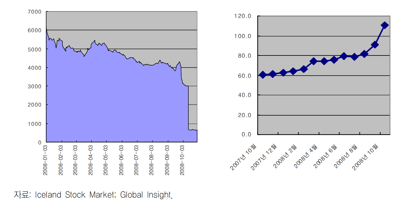 결국 신용평가회사인 피치(Fitch)는 5계단, S&P는 2계단, 무디스(Moody's)는 4계단씩 아이슬란드의 신용등급은 하락시켰습니다. 위기는 주식시장 역시 비껴가지 않았습니다. 10월 8일 금융위기 공식 선언 이후 거래일 3일동안 주식시장 거래를 전면 중단하였으나, 10월 14일 거래가 재개된 직후 주가지수는 77.4%나 급락하게 됩니다. 아이슬란드 증시의 대표지수인 OMX Iceland15의 경우, 2008년 1월 3일 종가는 6144.06이었지만, 2008년 10월 31일에는 651.36으로 연초 대비 무려 89.4%나 급락하게 됩니다.