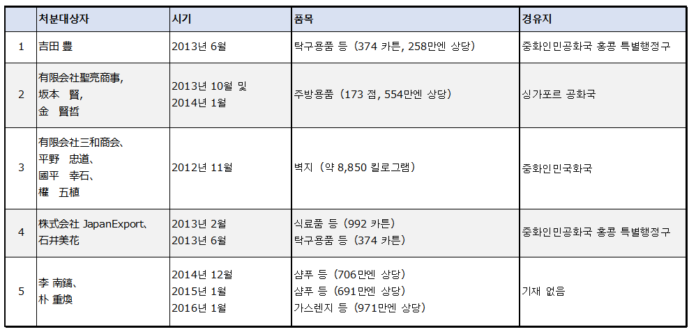 일본 경제산업성의 홈페이지에서는, 제3국을 경유해 북한에 대한 수출한 사안에 대해 행정처분을 실시한 결과를 게시하고 있습니다. 검색해본 결과, 총 5건이 적발되어 있는데, 그 내용은 아래와 같습니다.