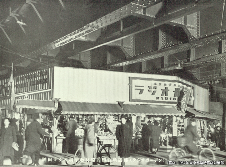 종전 직후의 아키하바라 근처에 위치한 칸다 주변 도로에는 현재의 도쿄전기대학(東京電機大学)의 전신인 전기공업전문학교(電機工業専門学校)의 학생들을 대상으로 한 라디오 부품 판매 노점이 다수 줄지어 있었습니다. 이때 라디오는 얼마 많지 않은 오락 중 하나였기 때문에, 라디오를 원하는 사람은 많았지만 문제는 전쟁에 의해 라디오 제조업체들의 공장 중 대다수가 소실되고 말았다는 것이었습니다. 이 때문에 완성품 라디오는 출하가 불가능한 상태였습니다.