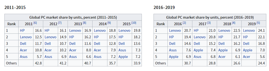 미국의 정보기술 연구 자문회사인 가트너(Gartner)에 따르면, 2020년 한해의 PC 출하량은 2억 7,500만대였다고 합니다. 이는 2019년에 비하면 약 4.8% 증가한 수준이며 10년만에 가장 높은 성장률을 기록한 것입니다. 이러한 컴퓨터 수요 증가의 주요 요인으로는 코로나 바이러스로 인해 재택근무가 촉진된 것이 주로 거론되고 있죠. 2020년 4분기의 출하량 추정치를 살펴보면 세계 시장 점유율을 보면 Lenovo가 27.1%를 기록하며 1위를 차지하고 있으며, HP Inc.(19.8%), Dell(16.6%), Apple(8.7%), Acer Group(6.0%), ASUS(5.8%)가 그 뒤를 잇고 있습니다. 음, 잠깐만요. 삼성이랑 LG는 어디에 있죠? 의외로 잘 알려져 있지 않은 사실이지만, 삼성과 LG는 순위권 밖에 있습니다. 국내 시장을 양분하는 두 회사이지만 세계 시장에서는 그다지 큰 두각을 드러내지 못하고 있는 것이 현실입니다. 대체 왜 그럴까요? 처음부터 국내 시장에만 집중했었기 때문에 그럴까요? 딱히 그건 아니었습니다.