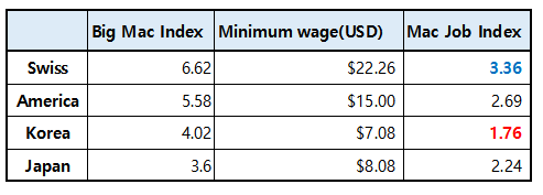 2019년 기준, 이는 각 나라의 최저시급을 빅맥가격으로 나누어 계산해 보면 이하 와 같이 됩니다.