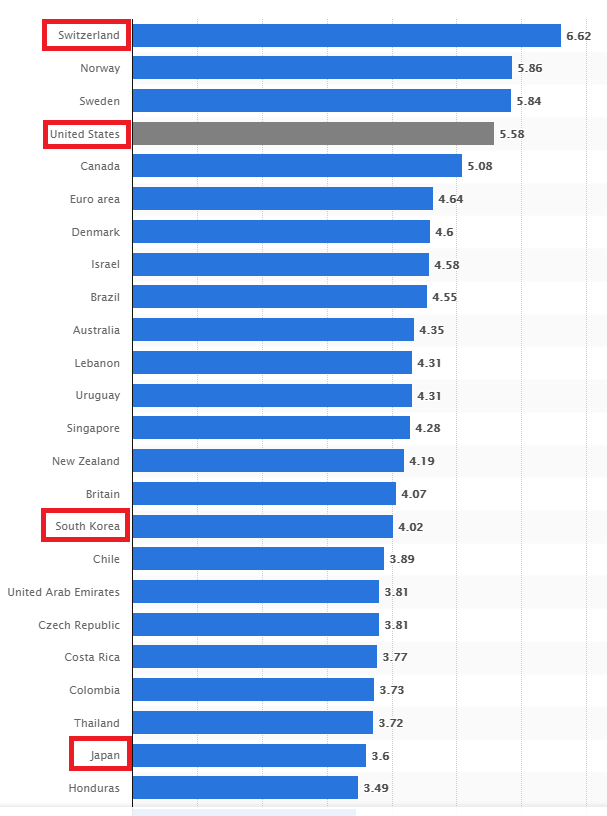 이를 보면 물가 수준 세계 1위는 스위스입니다. 미국은 4위, 한국은 16위, 마지막으로 일본은 23위에 해당합니다. 즉 달러로 환산한 명목 물가 수준만을 따지자면, 「스위스 > 미국 > 한국 > 일본」 순이 되는 겁니다.