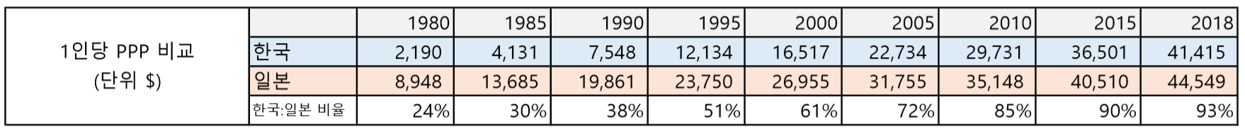 단, 실질적인 생활수준을 보여주는 1인당 PPP를 고려해보면, 지난해 기준으로 현재 한국은 일본의 약 93% 수준으로, 일본 도도부현으로 따지면 오사카나 교토 수준까지 높아져 있는 상태입니다. 1980년도의 한국의 1인당 PPP수준이 일본의 24%였다는 점을 감안해보면, 양국간의 차이는 점점 좁혀져오고 있는 것은 명백한 사실입니다.