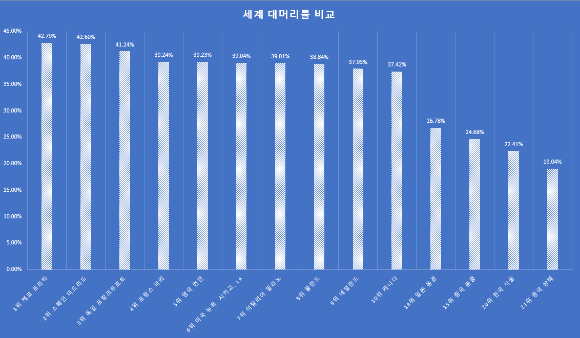 이에 의하면 대머리률 넘버원은 체코로, 무려 남성 인구의 42.79%가 대머리라고 합니다. 그 뒤로는 스페인(42.6%), 독일(41.24%)이 바짝 추격하고 있습니다. 아시아에서는 일본이 26.78 %로 1 위를 기록하고 있고, 그 다음이 홍콩(24.68 %) 과 싱가포르(24.06%)입니다. 한국은 22.41%로 조사 대상 21개국 중 20위로 굉장히 낮은 편입니다.