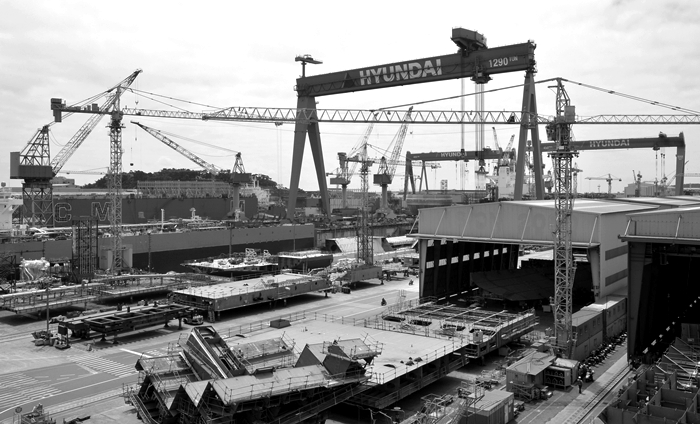 2000년대 후반, 일본 조선업계의 대규모 통합 및 재편은 이러한 숙련공 문제를 극복하기 위한 방안 중 하나였습니다. 그러나 한국 기업 측은 연간 10~20척의 LNG선을 한꺼번에 건조할 수 있는 대규모 설비를 갖추고 있었으며, 이를 바탕으로 수주한 선박을 연속으로 건조함에 따라, 기능공의 숙련도를 보다 빠르게 향상시킬 수 있었습니다. 그 결과 생산성에서 경쟁국인 일본을 압도할 수 있었고, 품질 면에서는 일본과 대등, 가격경쟁력에서 일본을 압도하게 됩니다.