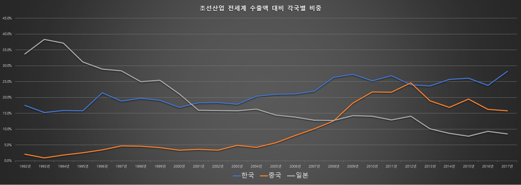 1980년대의 일본 조선업계의 대대적인 구조조정에 대한 반사이익을 얻을 수 있었고, 이로서 개선된 기술력・생산능력을 통해 2000년대 초반 세계 조선시장을 장악하게 됩니다. 그러나 곧 중국 업체들의 추격으로 점유율 1위를 내주게 되나, 2010년대 후반부터는 품질문제가 걸림돌이 되어 중국 조선사들이 주춤하게 되었습니다. 반면 한국 조선사들이 고부가가치 선종에서조차 품질・기술력을 세계정상급까지 끌어올리면서, 품질에서는 중국업체들을, 가격경쟁력에서 일본 조선업계를 압살하며 다시 세계 1위 자리를 탈환하게 되었습니다.